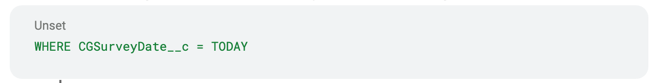 WHERE CGSurveyDate__c = TODAY