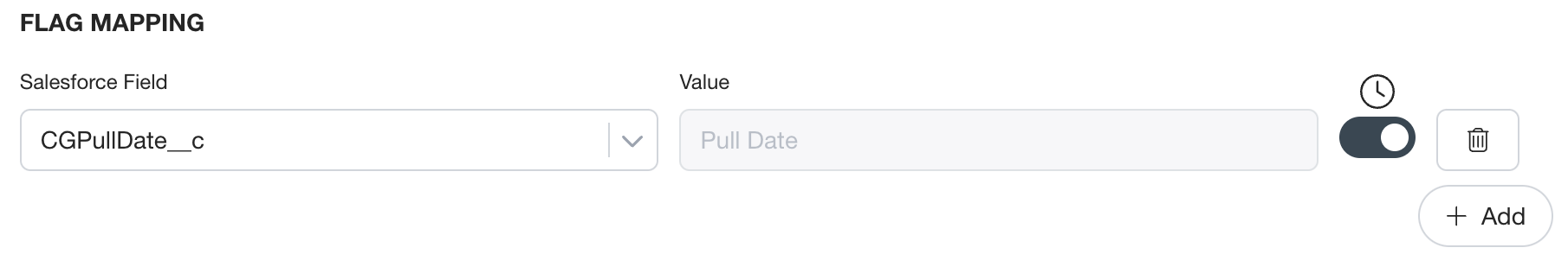 4. As part of your integration, set up the Flag feature to update your ‘CGPullDate’ with the date the record was pulled on once CG pulls the records. To enable the flag feature, turn on the toggle 'Flag pulled records' in the first page (Setting).